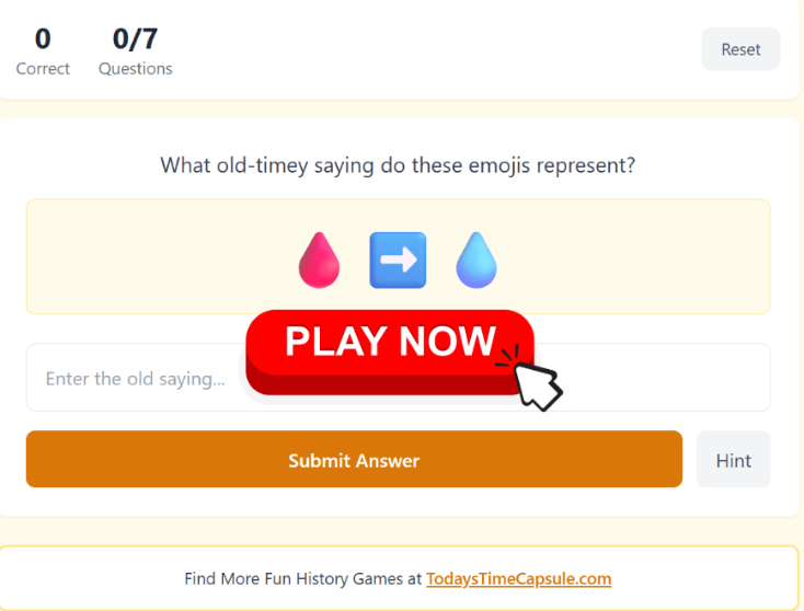 A fresh round of old-time sayings. Guess what the emoji clues represent. Play now.