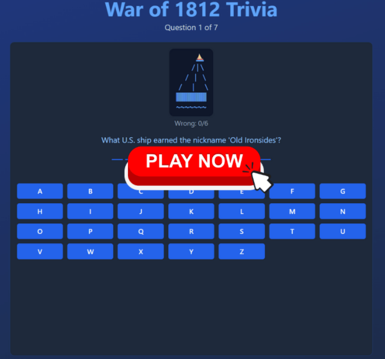 Fresh word game for Tuesday. 7 questions about the War of 1812. Start your game!